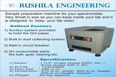 Offering Sample Preparation Machine. Sample preparation machine for your spectrometer. Very small in size so you can keep in side lab. It is design to keep your clean. Disc size is large and R.P.M. is high so sample preparation very fast.