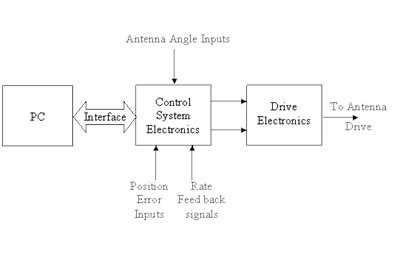 Control System : Active Control System. Two axes motion control. Continuous position loop and rate loop. Angular position inputs and rate inputs from antenna. Control System Interface with PC.